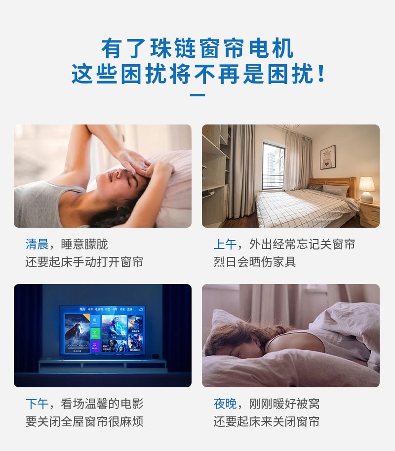 此產品適用于拉珠卷簾,可以把傳統(tǒng)的拉珠卷簾改變?yōu)橹悄茈妱哟昂煟惭b簡單,操作方便。安裝后可通過遙控器、語音、手機APP等控制窗簾升降。