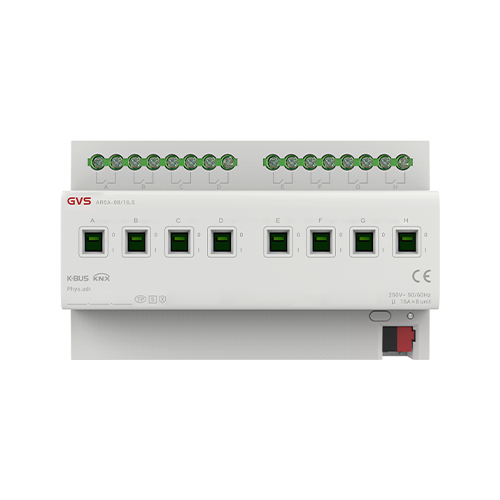 開關(guān)執(zhí)行器系列產(chǎn)品包含有4/8/12路,額定輸出有16A和20A,共六款可選,每路獨立輸出,采用了抗浪涌性能較高,具有機械式手撥操作的繼電器,適用于容性負載或LED燈??晒ぷ髟谄胀ǖ拈_關(guān)輸出,也可控制電熱閥。具有開關(guān)、場景、預(yù)設(shè)值、時間、閾值、強制操作、安全操作等功能。支持KNX安全。