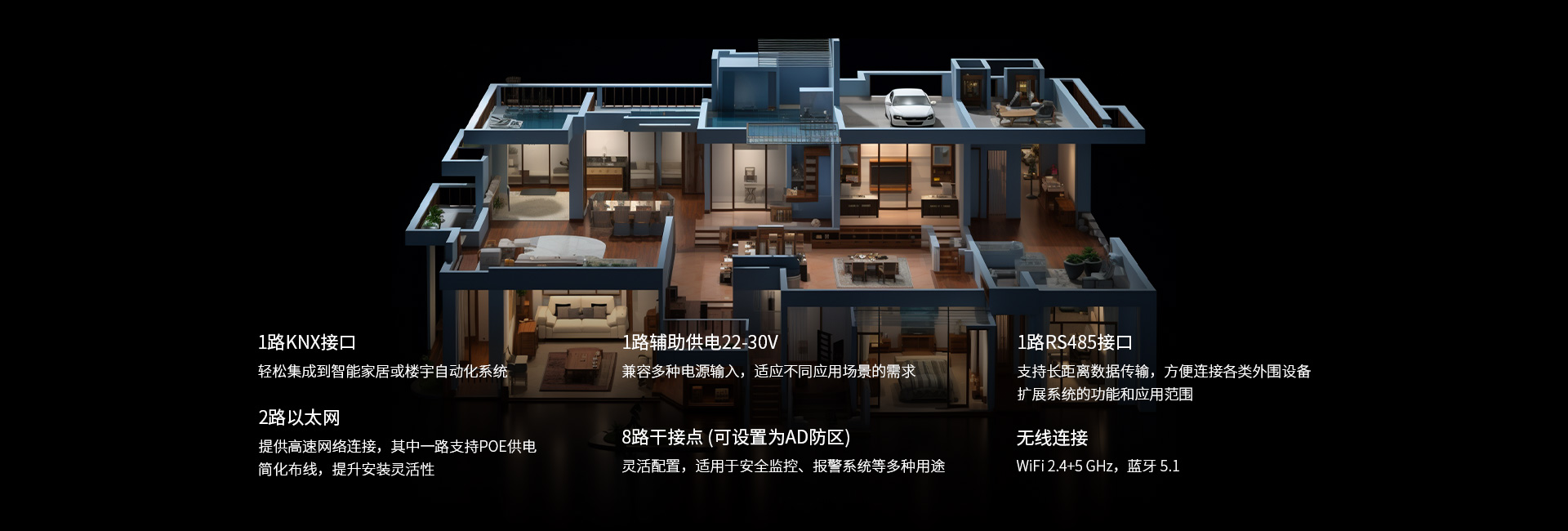 含1路KNX接口、2路以太網(wǎng)、1路輔助供電22-30V、8路干接點(diǎn)(可設(shè)置為AD防區(qū))、1路RS485接口,并支持WiFi 2.4+5 GHz,以及藍(lán)牙 5.1無(wú)線連接。