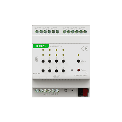 多功能執(zhí)行器是一個多路輸出模塊,集成了多種輸出功能,有開關輸出,窗簾DC/AC輸出,風機輸出和閥門輸出。根據(jù)需求可隨意配置本模塊的功能,比如一部分輸出用于控制開關,一部分輸出用于控制窗簾,一部分輸出用于控制風機等。多功能執(zhí)行器是模塊化安裝設備,為了方便安裝到配電箱中,根據(jù) EN 60 715 設計,能安裝在35毫米的丁導軌上,設備采用螺絲接線柱實現(xiàn)電氣連接,總線連接直接通過 EIB 接線端子連接,系統(tǒng)供電除總 線外不需要額外的電源電壓。